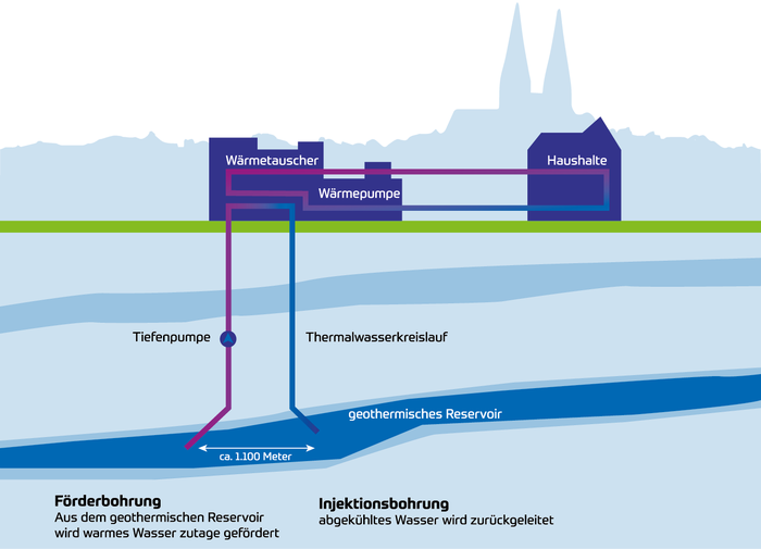 Für die Tiefengeothermiebohrung benötigt es zwei Bohrlöcher: die Injektionsbohrung und die Förderbohrung. Das Thermalwasser in der Tiefe wird durch eine Förderpumpe durch die Förderbohrung nach oben gepumpt. Dort wird dem Wasser die Wärme entzogen und in die Energieversorgung der Stadt eingespeist. Das kalte Thermalwasser wird mittels der Injektionsbohrung in das natürliche Thermalwasservorkommen zurückgeführt und gewährleistet somit einen geschlossenen und natürlichen Kreislauf.